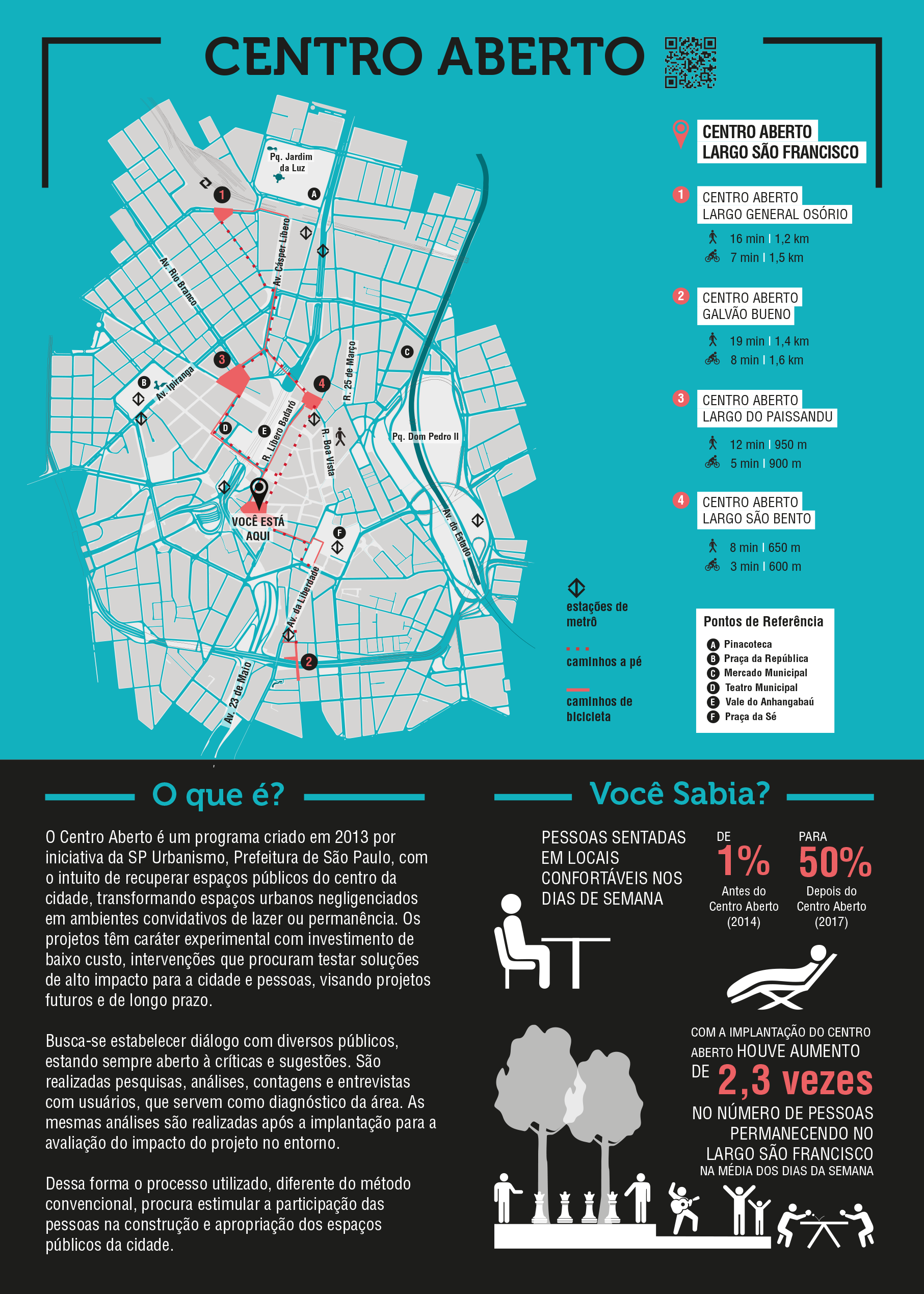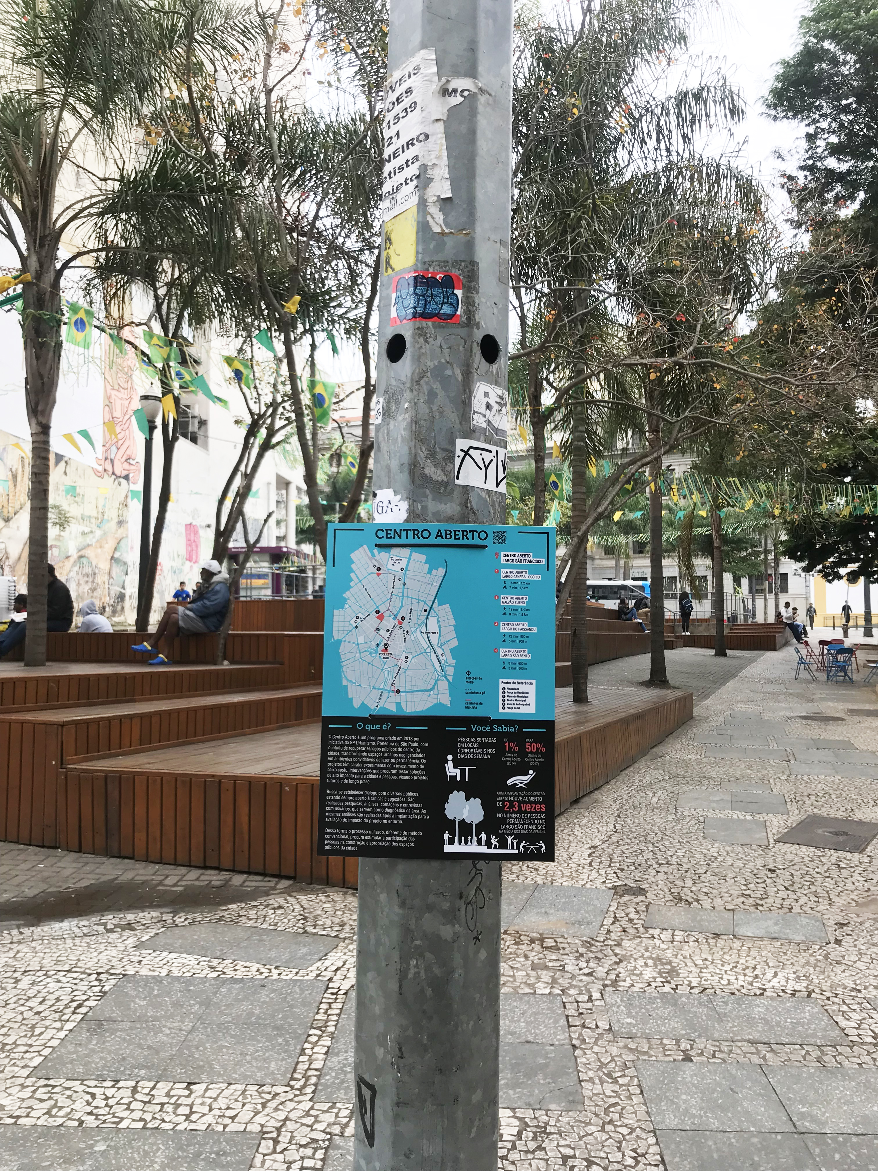 Uma das conclusões que chegamos em relação ao programa Centro Aberto durante a nossa participação nas pesquisas e elaboração do relatório em 2017, foi a de que os frequentadores de cada unidade conheciam pouco ou não sabiam que existiam das outras unidades do projeto. Para essa questão sugerimos em relatório que fossem aplicadas em cada unidade sinalizações gráficas indicando os trajetos para as demais.