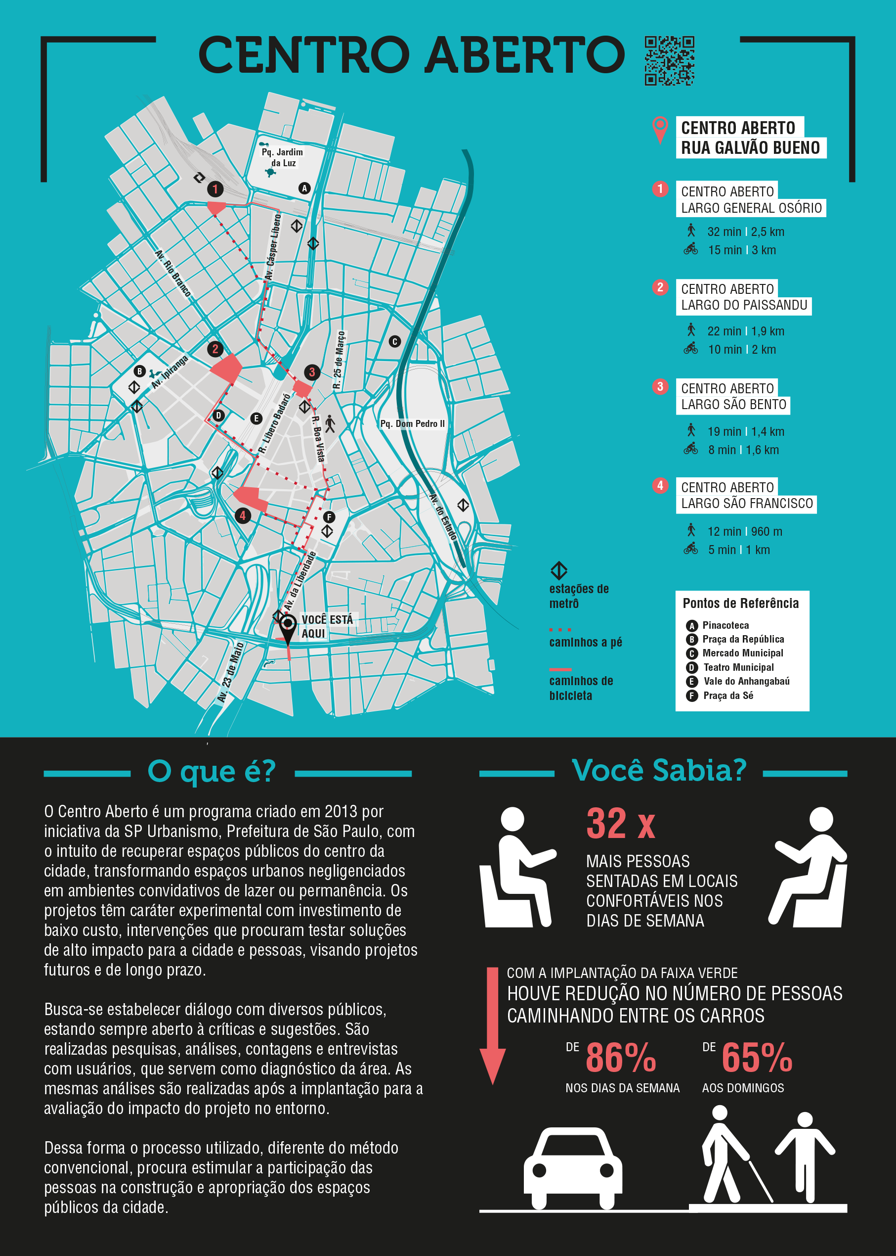 Por esbarrar em alguns procedimentos burocráticos a prefeitura não instalou as sinalizações, então, em 2018, como forma de intervenção urbana, criamos e instalamos algumas placas para o Centro Aberto com o objetivo de informar melhor os usuários sobre o conceito, processo e intenção do projeto, além de fortalecer o programa, conectando e unificando as 5 implantações . Desenvolvemos uma placa para cada unidade, com o mapa indicando o trajeto para as outras, com a distância e tempo de deslocamento a pé e de bicicleta, alguns dados sobre aquele local e um QR code para o download das cartilhas do relatório na página Gestão Urbana da Prefeitura.