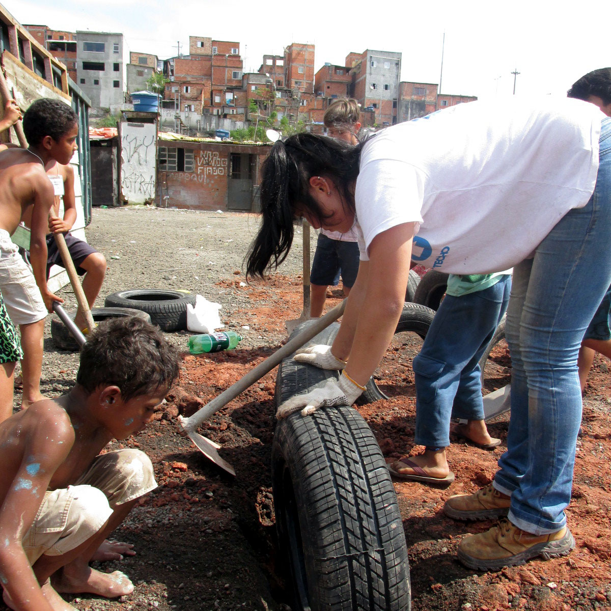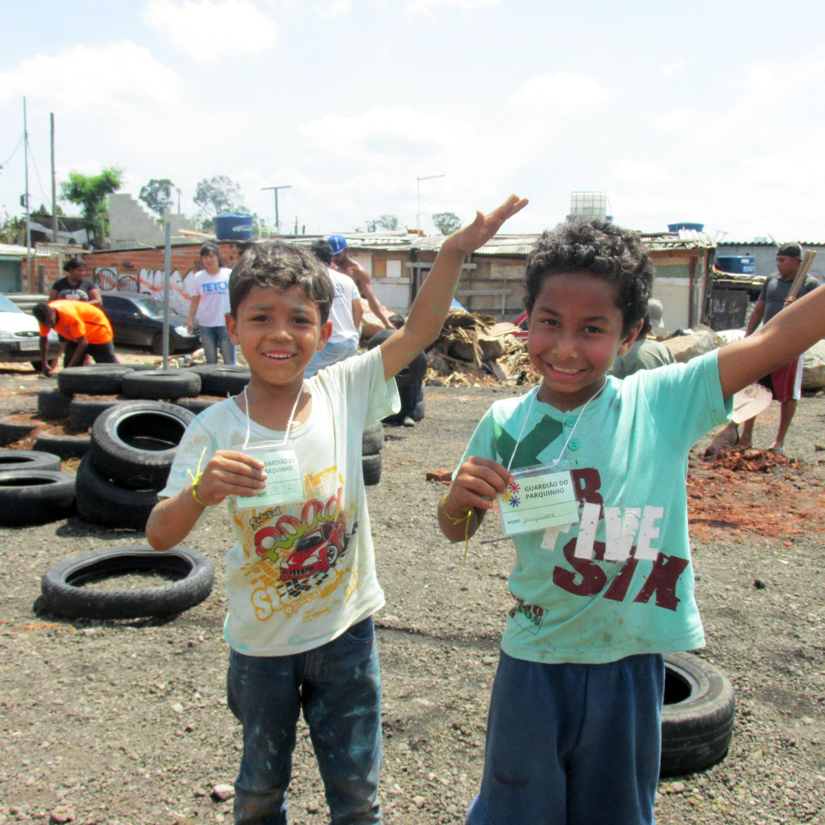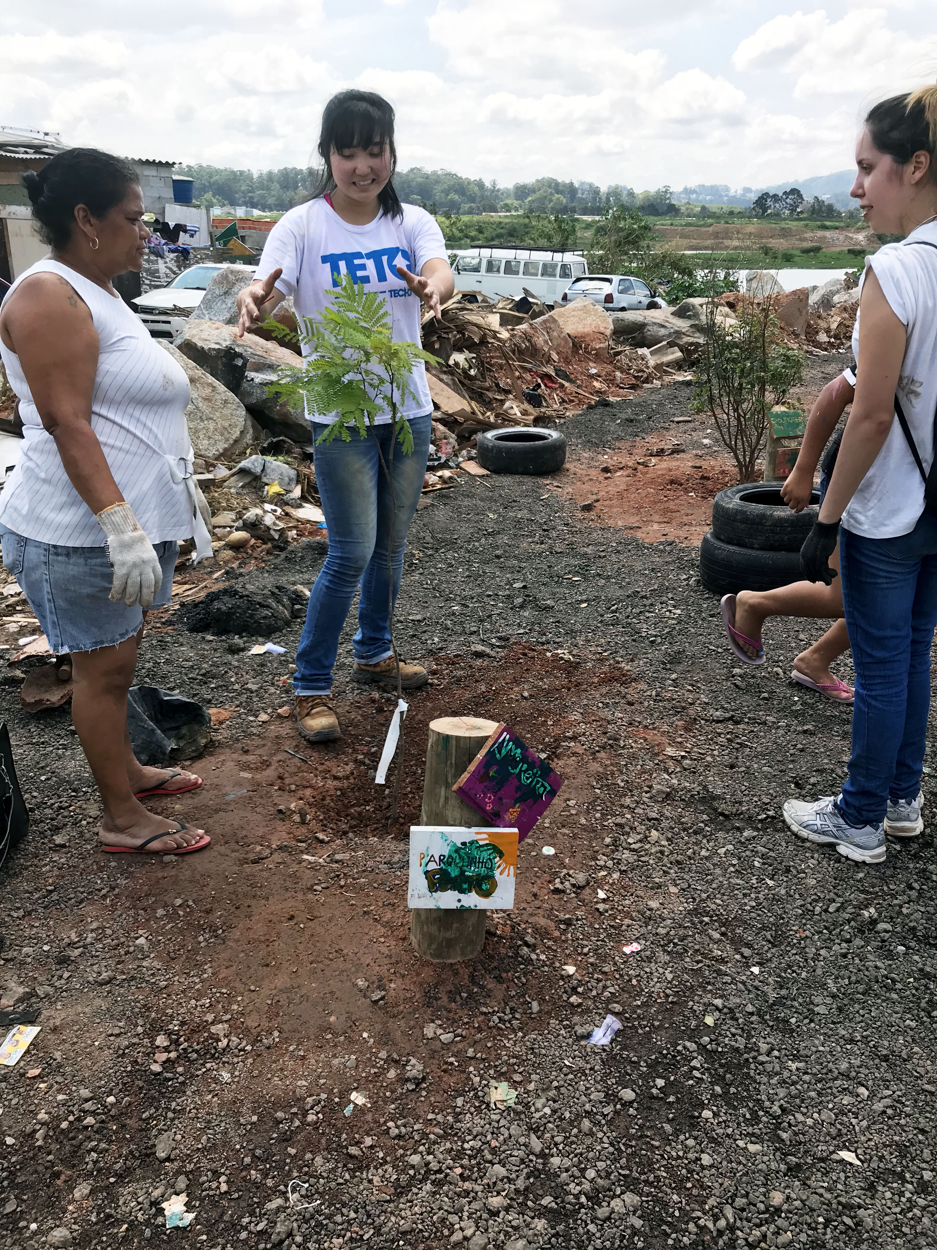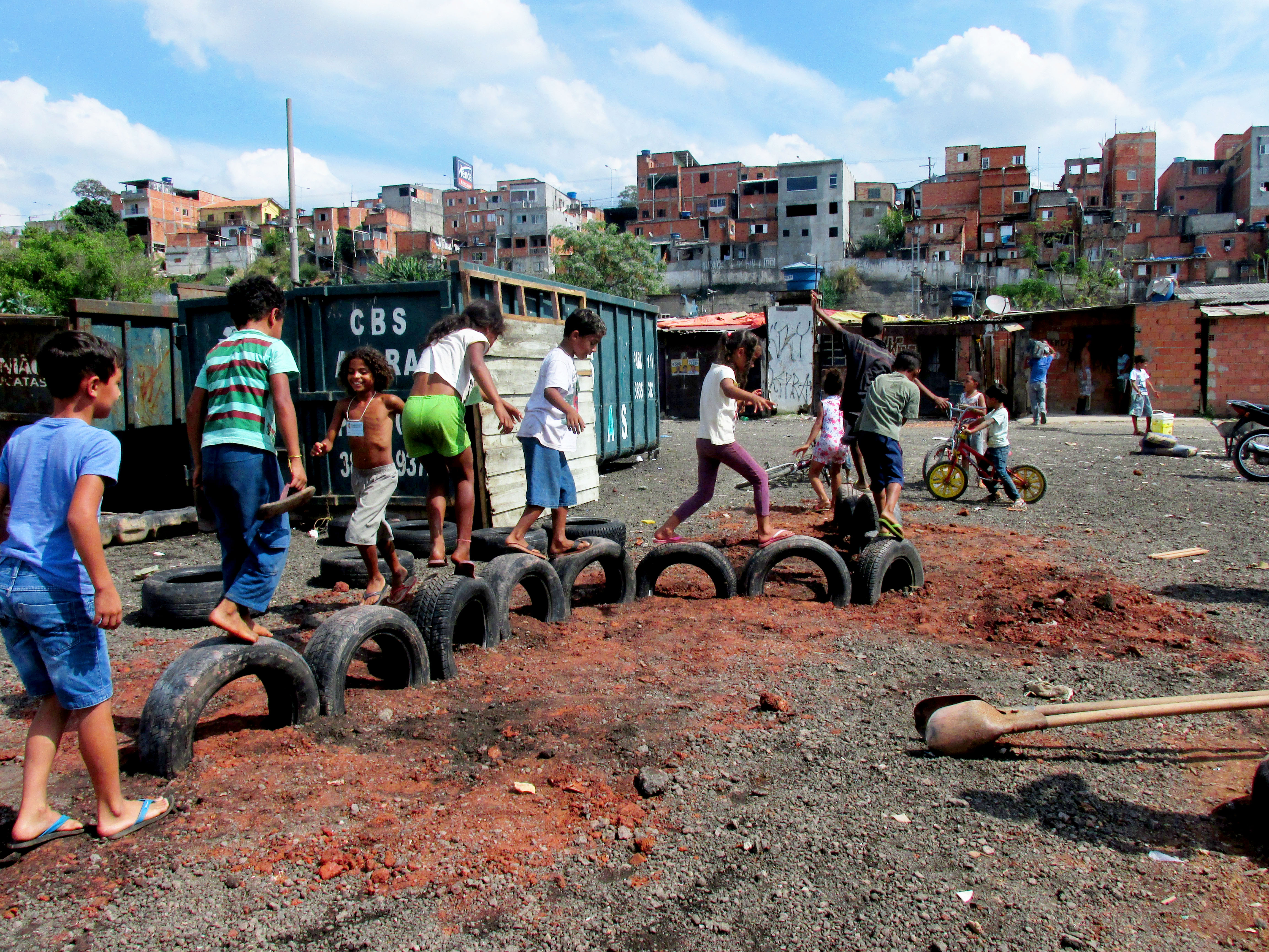 Com o projeto definido, começamos a ocupar o espaço. A intenção era evitar novas construções ou acúmulo de lixo, além de trabalhar o senso de pertencimento e construção do espaço, de forma gradativa, juntamente com a comunidade. Foi realizada, junto com moradores e voluntários do TETO, uma oficina de plantio de mudas frutíferas e depois, uma oficina de construção de um parquinho provisório feito com pneus.